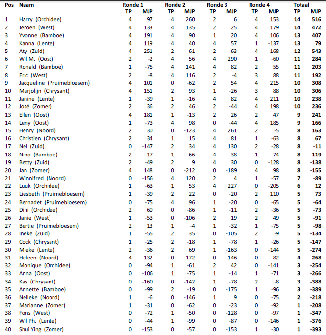 Na de lunch vol goede moed verder aan tafel met Wil, Annette en Mieke. Wil kwam snel op kop. Gelukkig nog 2 tafelpunten. Tussenstand, beetje in de middenmoot met 6 tafelpunten.
