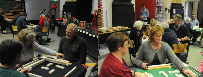 De met veel zorg en liefde gebakken koek gaven we af aan José en zagen tevens dat er aan koek vandaag geen gebrek zou zijn. Van diverse ‘vreemde’ toernooispelers hebben wij gehoord dat ze dat zo’n topinitiatief vinden van de Bamboe8-clubleden. Na wat socializen met diverse nauw aan het hart liggende clubleden kon het toernooi eindelijk beginnen. Het leuke van dit toernooi is natuurlijk dat er zoveel bekenden meedoen, dat je bij elke ronde wel met gezellige (lees mede-clubleden) aan tafel zit. Dit maakt het absoluut relaxed en de sfeer aan de tafels was hoor- en voelbaar door de hele zaal.