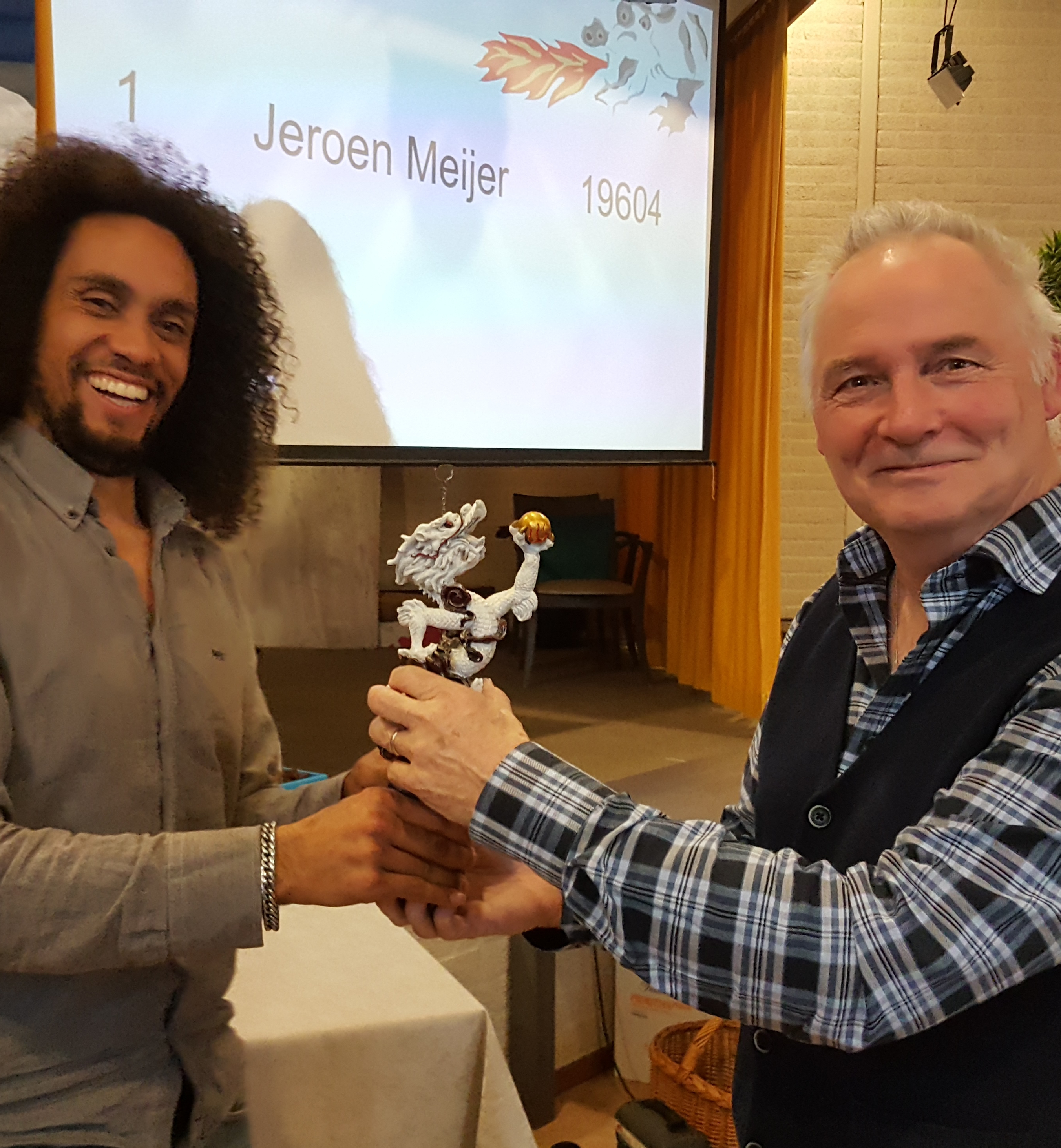 Geacht Genootschap, dank voor het mooie toernooi. Ik zal de Sneeuwdraak goed verzorgen, opdat hij volgend jaar weer in vol ornaat in Hilversum aanwezig zal zijn om verjaagd te worden. Want het lot van de draak is er te zijn om verjaagd te worden. Draken hebben geen Wong. Die komt stervelingen als ondergetekende toe. Soms. Als je geluk hebt.