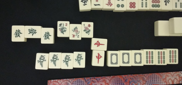 Ik nam in de halve finale van de beker aan tafel 1 plaats bij Jan, Mieke en Wil. Om ze een beetje te intimideren liet ik een t-shirt maken met een foto van de vorige week gewonnen, fraaie kampioenstrofee. En om die nog wat kracht bij te zetten pakte in het eerste spel een volledig dichte mahjong met vier pungs en mixed triple pungs (van drieën). Dat zette stevig de toon…