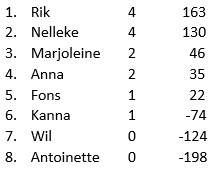 In het vierde spel wist ik nog een selfpick te maken, waarna ik besloot de voorsprong te koesteren. Mieke en Jan wisselden elkaar af met het halen van mahjongs en kwamen na 12 spellen rond de 0 uit. Wil had een grote achterstand maar haalde twee zelfgepakte mahjongs in het 13e en 15e spel.