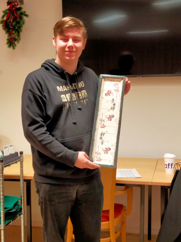 Luuk flitste uit de startblokken en zette zijn mede-finalisten op flinke achterstand met vier mahjongs op een rij. Marjoleine en Yvonne (3x!) waren de gulle gevers. De remise in het vijfde spel bleek Luuk flow niet echt te hebben doorbroken, want ook het volgende spel wist hij voor zich op te eisen. Hij gunde Yvonne vervolgens de winnende steen in het zevende spel en zag onbewogen hoe Marjoleine voor de tweede wissel zelf mahjong maakte met de laatste steen van de muur.