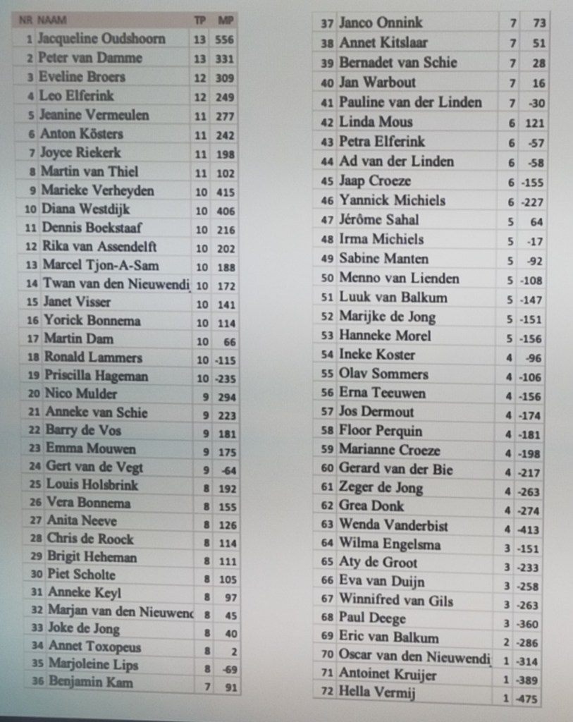 Uit de 13-mans delegatie Bamboe Acht’ers was het ditmaal was het Jacqueline die met deze eer ging strijken tijdens de 15e editie van de Reus van Rotterdam. In een deelnemersveld van 72 competitiespelers bleek slechts een trio – Diana Westdijk, Eveline Broers en Jacqueline dus – in staat de twee eerste partijen te winnen.