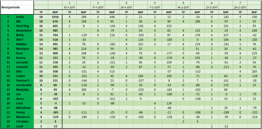 Groen 2016-2017 Nog geen jaar lid en Marjoleine wint de Noordperiode. Ze plaatst zich voor de promotiewedstrijden. Eindstand Noordperiode (best of five) Periodekampioen InekeZe plaatst zich voor de promotiewedstrijden. Eindstand Westperiode (best of five) Nelleke is periodekampioen en plaatst zich voor de promotiewedstrijden. Eindstand Zuidperiode (best of five) Betty won de Oostperiode Eindstand Oostperiode (best of five) Vind-ik-leuk Aan het laden...