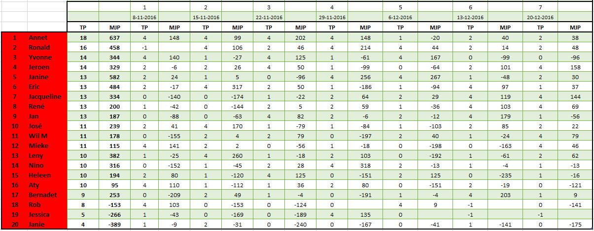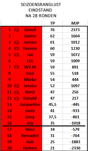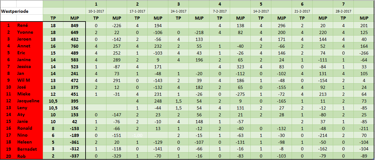 Rood 2016-2017 Clubkampioen Jan Verslag finalewedstrijden De vier finalisten in de strijd om het clubkampioenschap. Wil won de laatste periode Eindstand Noordperiode (best of five) Westperiodekampioen René Eindstand Westperiode (best of five) Annet Zuidperiodekampioen Eindstand Zuidperiode (best of five) Jan won de Oostperiode Eindstand Oostperiode (best of five) Vind-ik-leuk Aan het laden...