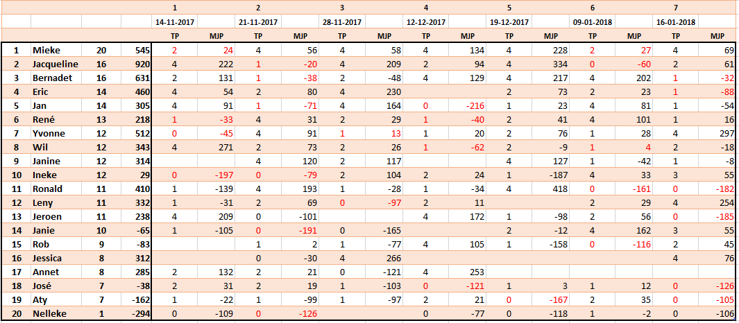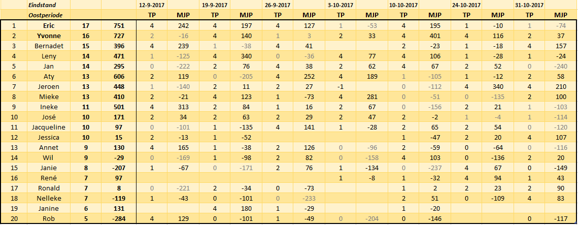 Rood 2017-2018 Clubkampioen Eric Eindstand kampioenschap Yvonne eerste bekerwinnaar Verslag bekerstrijd en promotiewedstrijden Ronald is kampioen van de Noordperiode.Wil vergezelt hem naar de bekerstrijd. Eindstand Noordperiode (best of five) Yvonne is kampioen van de Westperiode. Jan en René kwalificeren zich voor de bekerstrijd. Eindstand Westperiode (best of five) Eindstand Zuidperiode (best of five) Eric en Yvonne kwalificeren zich voor de halve finale van het bekertoernooi . Eindstand Oostperiode (best of five) Dit delen: Klik om te delen op X (Opent in een nieuw venster) X Klik om te delen op Facebook (Opent in een nieuw venster) Facebook Vind-ik-leuk Aan het laden...