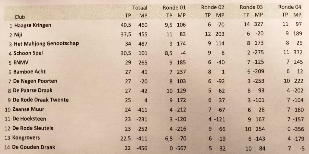 | 7 | Rik Hartig | Het Mahjong Genootschap | 11 | 56 | 4 | 95 | 4 | 64 | 2 | 18 | 1 | -121 |