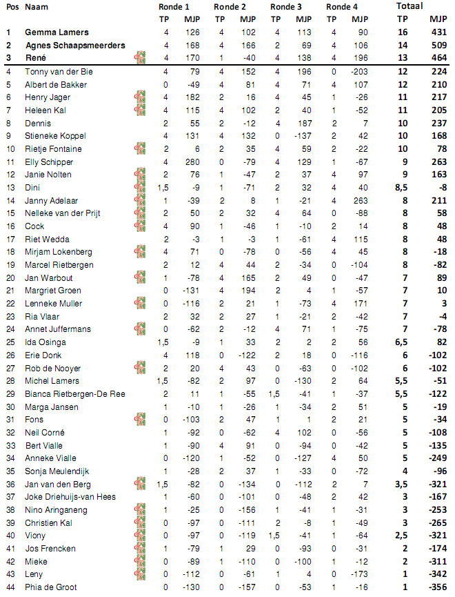 | 1 2 3 4 5 6 7 8 9 10 11 12 13 14 15 16 17 18 19 20 21 22 23 24 25 26 27 28 29 30 31 32 33 34 35 36 37 38 39 40 41 42 43 44 45 46 47 48 49 50 51 52 53 54 55 56 57 58 59 60 61 62 63 64 65 66 67 68 | Dimphy van Grinsven Petra Elferink Desirée Heemskerk Gerda van Oorschot Hanneke Morel Paula Pereira Gomes Chris Scheffler Diana Westdijk Marianne Croeze Hans van der Poel Gertjan Davies Wim Rijnders Ad van der Linden Ingrid Broeder Yvonne van der Heide Anton Kösters Peter van Damme Janine Scholtemeijer Harry Kal Robert Rijnders Marian Peerdeman Heiko Domann Zeger de Jong Ellen Jager Cees van den Brink Caroline Kopmanis Jeroen Meijer Conny Scheffler Marleen Dewolf Eugenie Teunissen Jacob van der Zee Ton Rijnders Eric van Balkum Leo Elferink Pauline van der Linden Leni Janssen Rudi Kopmanis John Kuijpers Jaap Croeze Anita Neve Adrie van Geffen Thérèse Roblin Dewi Satriasaputra Aty de Groot Janco Onnink Martha Pasterkamp Chris Janssen Michel van Damme Menno van Lienden Ans Hoogland Eveline Broers Gerard van der Bie Yvonne Heemskerk Rudy Wong-Chung Berry Heijn Trees Meijer André Rijnders Hans Rijnders Jack’lien Pilgram Diana Vonk-van de Wetering Anneke Keyl Els Kuijpers Rick van der Linden Marieke Verheyden Inge van Nuland Chris Redmond Wil Meijer-Kal Irma Michiels | 14 14 12 12 12 11 11 11 11 11 11 10 10 10 10 10 10 10 9 9 9 9 9 8,5 8 8 8 8 8 8 7 7 7 7 7 6,5 6 6 6 6 6 6 6 6 6 5 5 5 5 5 5 5 4 4 4 4 3 3 3 3 3 3 2 2 2 2 1 1 | 459 449 681 348 174 383 331 274 265 174 58 387 312 259 195 154 100 42 219 172 103 98 17 -68 206 128 84 57 -39 -47 65 30 -18 -54 -142 -7 134 64 6 -77 -79 -104 -115 -204 -232 -67 -123 -126 -135 -200 -306 -319 -59 -62 -120 -229 -181 -185 -209 -232 -272 -351 -301 -310 -344 -434 -315 -362 |